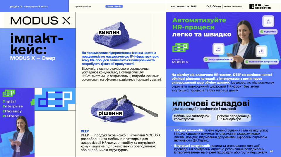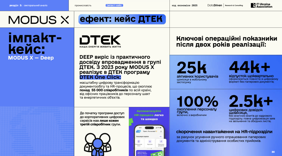 MODUS X долучився до національного дослідження «Код економіки», яке цього тижня представила IT Ukraine Association — найбільша профільна ІТ-асоціація України. У межах дослідження продукт DEEP включено до секторального аналізу як impact-кейс цифрової трансформації промисловості.